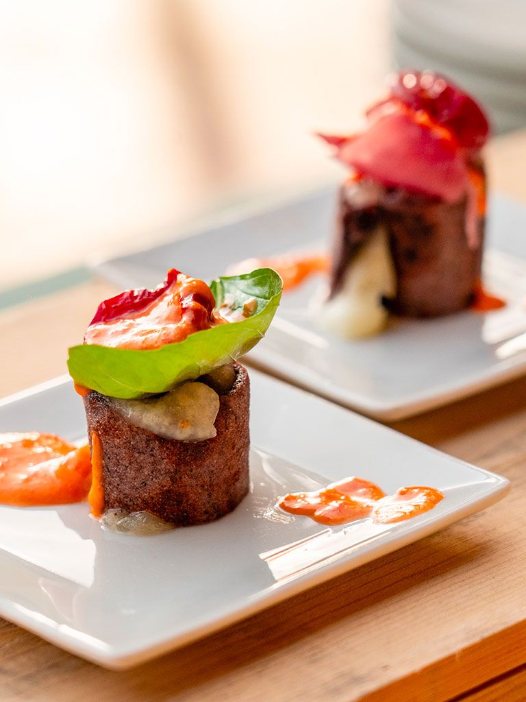 - Sushi pizza: roll di pizza di riso venere, ripieno di fior di latte, crudo del maiale nero di Faeto, salsa di pomodoro fresco